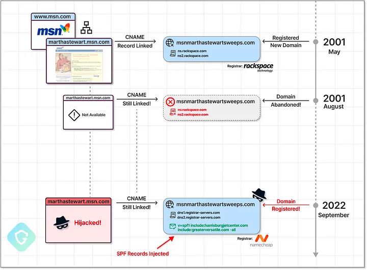 報告稱這項活動最早可以追溯到 2022 年,攻擊者劫持了屬于合法公司和機構的 8000 多個域名和 13000 個子域的控制權,其中包括 MSN、VMware、McAfee、經濟學人、康奈爾大學、哥倫比亞廣播公司、漫威、斯沃琪、賽門鐵克、美國公民自由聯盟、普華永道、美國商業促進局、聯合國兒童基金會和 eBay 等在內的一些知名品牌和機構。