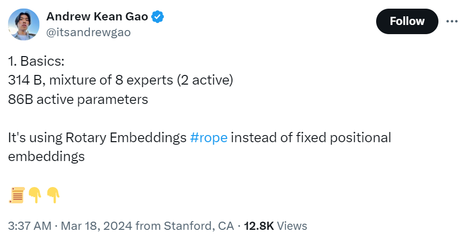 還有一位推特用戶 @itsandrewgao 詳細(xì)分析了 Grok-1 的架構(gòu)細(xì)節(jié),并做出了一下幾點(diǎn)總結(jié)。