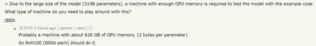 看到這,有網(wǎng)友開始好奇 314B 參數(shù)的 Grok-1 到底需要怎樣的配置才能運(yùn)行。對(duì)此有人給出答案:可能需要一臺(tái)擁有 628 GB GPU 內(nèi)存的機(jī)器(每個(gè)參數(shù) 2 字節(jié))。這么算下來,8x***(每個(gè) 80GB)就可以了。