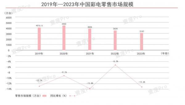 奧維云網數據顯示,最近五年間,我國彩電市場零售量一路下滑,已從2019年的4016.6萬臺下滑至2023年的3142萬臺。