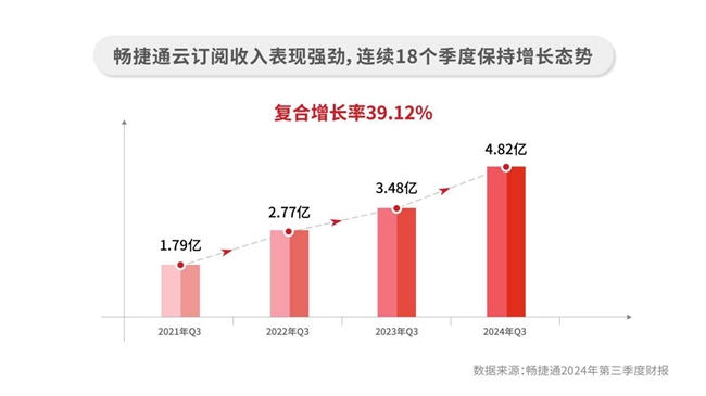 10月30日,暢捷通發布2024年三季度財報。報告期內,暢捷通實現營收6.75億元,較上年同期增長24%,其中云訂閱收入4.82億元,較上年同期增長38%。財報數據顯示云訂閱收入占總收入的比重為71%,連續18個季度保持增長態勢,毛利較上年同期增加1.28億元,毛利率由去年同期的64%增長至71%。