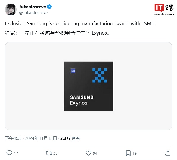 消息源 Jukanlosreve 昨日(11 月 13 日)在 X 平臺發布推文,曝料稱三星正考慮委托臺積電量產 Exynos 芯片。