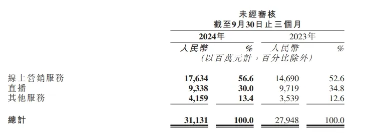 快手增長的主要驅動力來自線上廣告業務。本季度,線上營銷服務收入達176億元,占總營收的56.6%,成為快手最大的營收來源。值得注意的是,快手的線上廣告業務更多依賴于自身電商商家的廣告投放,而非外部廣告投放業務。公司在2022年至2023年的財報中明確指出,廣告業務的增長“主要得益于電商商家的投放”。