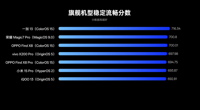 ColorOS各類絲滑動效,助力OPPO Find X8在魯大師體驗評測(實驗室)中,獲得響應時延、完成時延、動效三大板塊實測亮眼成績,實測結果顯示,Find X8最終以700.01的穩定流暢分,在旗艦機型中奪得第三名。