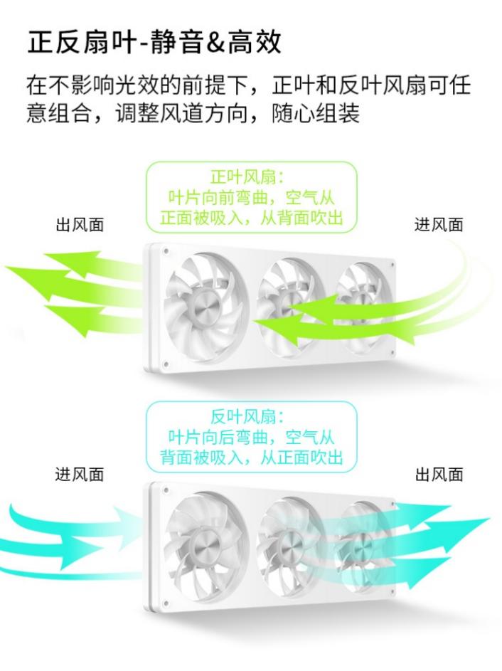 為了兼顧簡易安裝與風道構建的自由度,JK-F360提供了正葉與反葉兩種獨立版本。用戶可以根據實際需求(作為進風或出風),自由選配不同版本的風扇來構建理想風道。這種設計的巧妙之處在于,無論風向如何,風扇絢麗的光效永遠“正面”朝向用戶,完美解決了傳統反葉風扇美感不足的痛點,讓性能與視覺不再妥協。