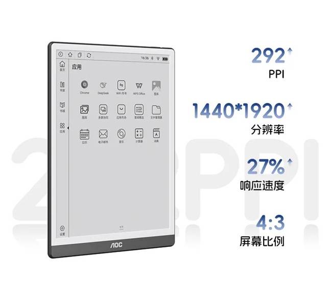 搭載RK3566四核處理器與4GB內存 + 64GB存儲組合,無論是打開厚重文檔還是多任務切換,都能順滑響應。AOC自研E Ink優化顯示引擎支持四種刷新模式(高清、普通、快速、極速),并提供深色增強、淺色過濾與第三方APP顯示優化功能,27%響應速度提升讓翻頁更迅捷。Wi-Fi雙頻與藍牙5.0確保連接穩定,3000mAh大電池搭配超低功耗技術實現數周續航,讓靈感與閱讀都不被電量打斷。